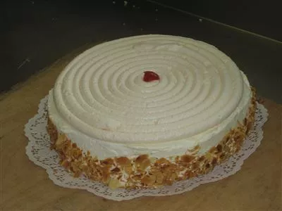 Zu guter Letzt wird die Torte zusammengesetzt. Der Boden bildet die Meringuage, darauf kommt eine erste Lage Rahm. Dieser wurde vorab geschlagen, leicht gezuckert und mit Gelatinepulver etwas stabiler gemacht. Mit dem Plastikspatel nimmt der Bäcker eine Portion Schlagrahm und verteilt ihn auf dem Meringuageboden, er darf über den Rand hinaus kommen. Als dritte Lage wird nun das getränkte Biskuit aufgelegt. Die vierte Lage ist wieder Schlagrahm. Der Schlagrahm wird über alle Lagen auf die Tortenseite verteilt, die Tortenoberseite wird gleichmässig glatt gestrichen. Nun erhält die fast fertige Torte an der Seite eine Dekoration aus gerösteten Mandelscheiben. So kommt sie auf ein grosses, dünnes Holzbrett auf dem das Tortenspitzpapier schon bereit liegt. Nun platziert der Bäcker die letzte Lage: Die fünfte Schicht ist ein zweiter Meringuageboden.